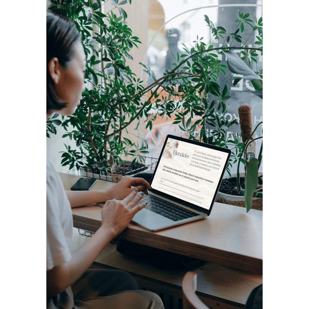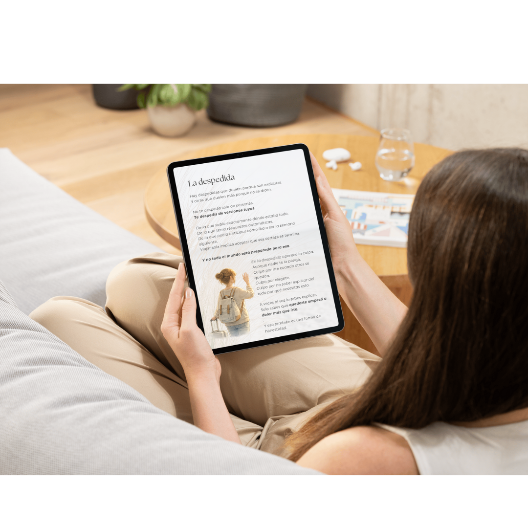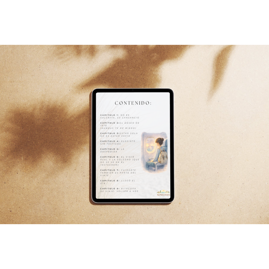 Este ebook no empieza el día que te subís al avión ni termina cuando volvés. Te acompaña desde el momento en que aparece la idea de viajar sola, pasando por el día en que te vas, hasta lo que sentís cuando ya estás en camino o cuando volvés distinta.
